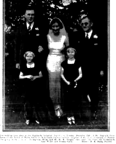 Married: In Nairobi 15 Dec 1931 Leslie Joyce Coverdale b. 24.7.1906 Bloemfontein, d. 5 Mar 2010 Somerset West, S. Africa