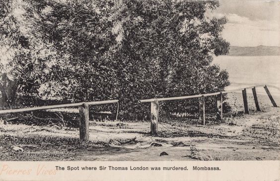 Judy Aldrick, Sir Ali Bin Salim and the Making of Mombasa, 2018 - A young ship's engineer named Thomas London had gone ashore at Port Reitz in December 1907 and sat down to rest by a small stream, where he was killed, apparently for no reason. For several weeks the death remained a mystery despite all enquiries. But eventually Ali bin Salim's investigations proved that a powerful Digo wizard named Mwakilungu had instigated it as a ritual killing. Mwakilungu and his four accomplices were arrested and brought to trial, where they admitted they had engaged in white killings, starting with a white fowl and ending with a white man, believing it would increase their magical powers. This was the first murder case tried in the British law courts in Mombasa and the first public hanging in Kenya. A well-known photograph shows the five convicted men with their hands shackled.' They were hung at Mtongwe in 1912. A newspaper report says that Thomas was the son of one of the directors of the Cable & Wireless Co. in Mombasa. It reported he was a ship's engineer who went for a stroll and was killed resting beside a small stream.